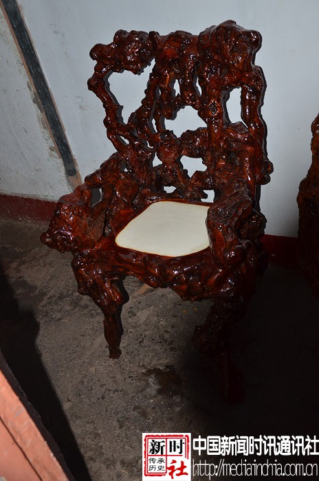 山上的灌木丛树根经过他们用巧手细心的雕琢变成了一把漂亮的仿古椅子