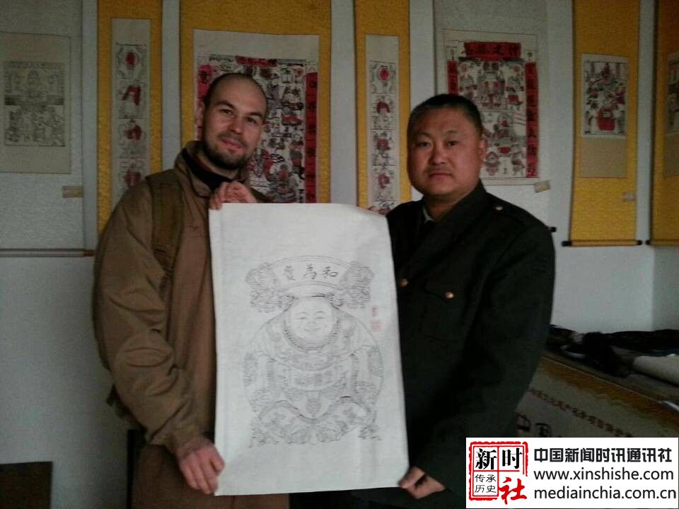 2014年12月11日,俄罗斯民间艺术品博物馆贝科夫瓦洛佳在闻一雷女士等一行的陪同下,专程从北京来到内黄县年画艺术馆进行文化艺术交流,并亲自体验池家年画印制技艺。
