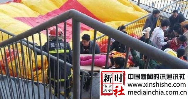现场图片显示,在底商楼顶在气垫旁,一名女孩倒地,头部有血迹,旁边有消防人员和医护人员正在工作。