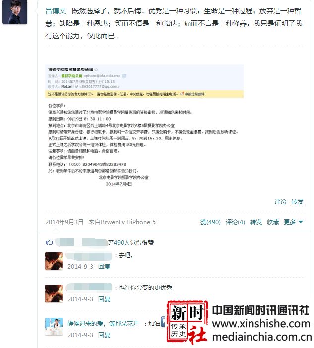 近日,有网友爆出吕博文认证空间的一张说说截图,截图上表示吕博文早在2014年7月4日已经收到北京电影学院摄影学院的录取通知书,要求报道上课,但根据吕博文说说内容的表述,他表示放弃这次机会,“放弃是一种智慧,既然选择了,就不后悔,我只是证明了我有这个能力,仅此而已”。