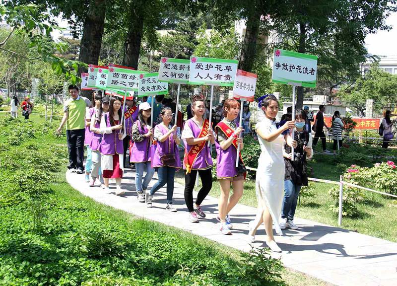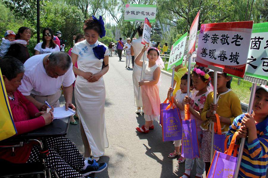 牡丹盛开,争奇斗艳。近几天长春市牡丹园游人如织,在游客周围出现一队一队的志愿者,宣传爱护花草,保护环境,拣拾垃圾,劝阻不良行为。这些是长春市柏合助老志愿者协会发起并组织的。在会长李桂梅的带领下,市民、退休职工、在校大学生,少年儿童和家长,都积极地参与这项公益活动。他们的口号是“垃圾不落地,争当文明人”,“孝亲敬老,善暖春城”。他们伴随着“三大纪律八项注意”的乐曲,举牌宣传社会新风,拣拾丢弃的垃圾。人们都投来赞许的目光,有的还用相机手机给他们拍照。他们还宣传孝亲敬老,弘扬中华民族的传统美德,并组织了万人孝亲长卷的签名活动。