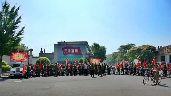 上午10时,全体人员在汾阳贾家庄红色纪念馆前合影,并齐唱“大海航行靠舵手”。之后骑行至距市区10多公里的张家堡红色教育宣传基地。