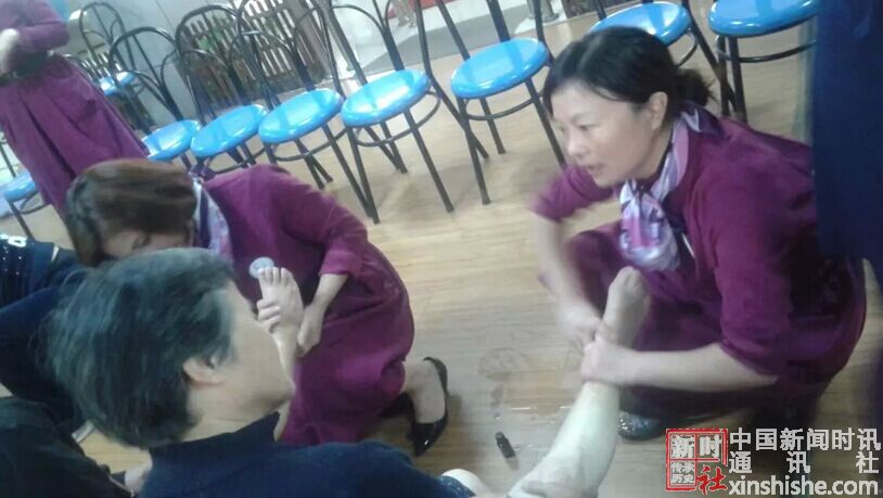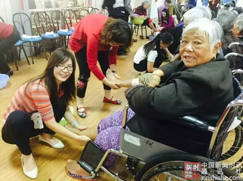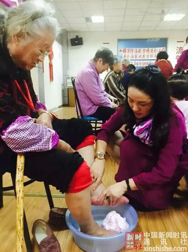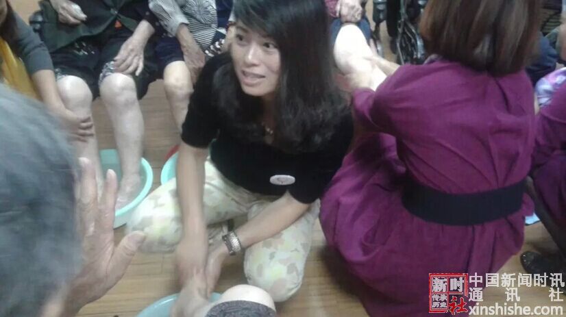 在敬老院的礼堂现场,老人们端上自己的脚盆,护理人员调好洗脚水,女企业家们蹲下来为老人洗脚,修指甲,摸精油。