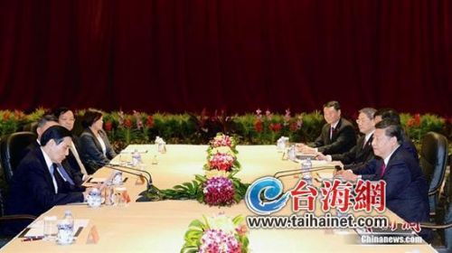 新时社网11月8日讯(特派记者刘强许巧娜文/图)两岸领导人习近平、马英九在新加坡香格里拉酒店会面。这是自1949年以来,两岸领导人首度历史性握手。双方简短寒暄、致辞后,随即展开1小时的闭门会面,就推进两岸关系和平发展交换了意见。习近平指出,面对新形势,站在两岸关系发展的新起点上,两岸双方应该胸怀民族整体利益、紧跟时代前进步伐,携手巩固两岸关系和平发展大格局,共同实现中华民族伟大复兴。