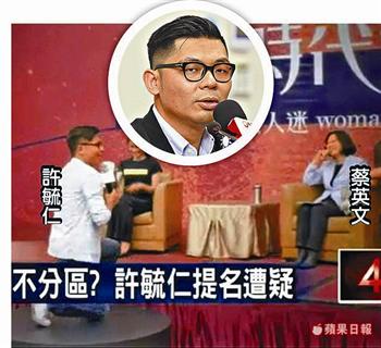 台湾《联合晚报》报道称,国民党提名TEDxTaipei创办人许毓仁担任不分区且排名第5,但一张许毓仁向蔡英文单膝下跪的照片,在国民党内快速流传并引发争议。