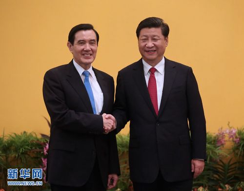 当地时间下午3时,习近平、马英九同时步入会见大厅。在数百名中外媒体记者的瞩目下,在响成一片的快门声中,两岸领导人的手紧紧握在一起,共同翻开两岸关系历史性的一页。这一刻将载入两岸关系史册。