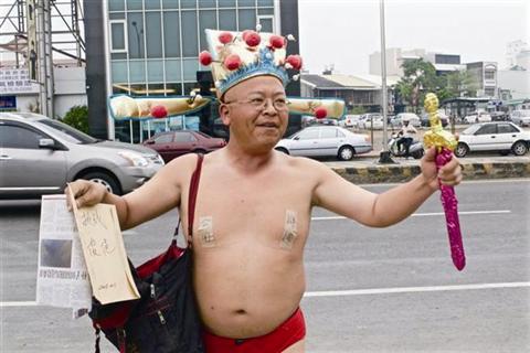 只见黄宏成头戴财神帽,手持尚方宝剑,右乳贴肤色胶布,胶布上写着公开,左乳贴着辩论,从距离李俊俋竞选总部100米处起,踢正步、唱军歌,大胆行径引起路人侧目。