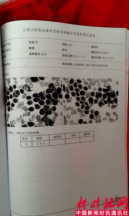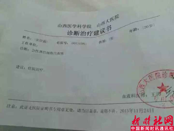 家住山西省汾阳市阳城乡乔家庄村的张佳鑫今年刚刚20岁。2015年11月初,张佳鑫感觉身体不适,以为只是普通的感冒,自己吃了点药就依然坚持上班了。因为他从小就看到父母的辛苦,便早早的去外面打工为家里补贴家用。但没想到越来越严重,直至坚持到不能再继续工作了,单位的同事把他送回家,父母看见其脖子、耳朵后边起了好多大疙瘩,立即带他医院检查,结果疹断为:急性淋巴细胞白血病。看着检查报告单,如同晴天霹雳打到他父母身上,至少50万的医疗费,对于这样一个普通的农村家庭来说无异于天文数字。张佳鑫今年才20岁,人生刚刚开始,就遭此厄运,其母亲每天以泪洗面,面对如此庞大的治疗费用,如何负担得起。