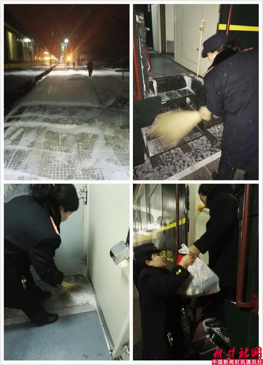 2月15日凌晨,突来大雪.人们正是熟睡的时候,太原铁路局太原客运段包头开往临汾2643次列车二组,在任云、王芳两位党员车长的带领下,为旅客“三个出行”保安全,及时清理冰雪,做好安全乘降、帮扶工作,确保列旅客乘降安全。