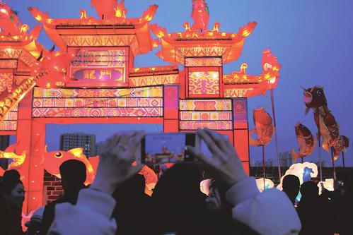 游客们用手中的相机,为大同古都灯会点赞。郑亦工 摄