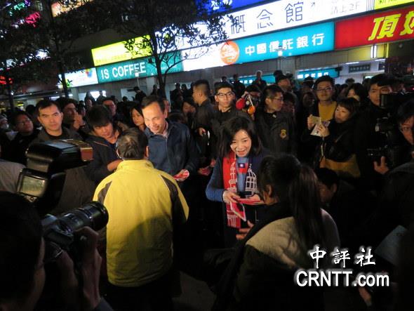 新时社网1月1日讯 中国国民党主席、总统候选人朱立伦和他的夫人高婉倩在12月31日晚上跨年夜时一同到忠孝东路顶好商圈发放暖暖包,现场完全挤爆,民众争相排队索取、和朱立伦、高婉倩合照留念,短短20分钟就发送完毕。