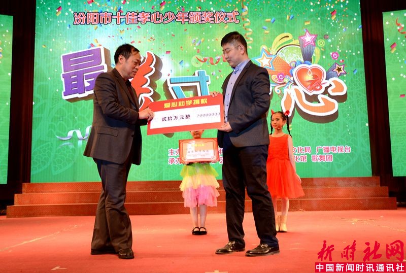 (本社记者:赵志伟讯)2月20日下午,汾阳市贾家庄裕和花园礼堂一团和气,欢声连连,正在举行的是由汾阳市教科局、文明办、团市委、文化局、广播电视台主办的“汾阳市十佳孝心少年颁奖仪式”。参加此次活动的有市四大班子分管领导,各乡镇、街道办领导,组宣员,还有各学校校长、园长,部分老师同学们及结对帮扶的企业负责人。