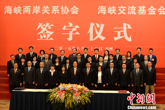 8月25日,在福州举行的两岸两会领导人第十一次会谈取得新成果,双方下午举行签字仪式,签署《海峡两岸避免双重课税及加强税务合作协议》和《海峡两岸民航飞行安全与适航合作协议》。图为全体参会人员合影留念。中新社发 王东明 摄