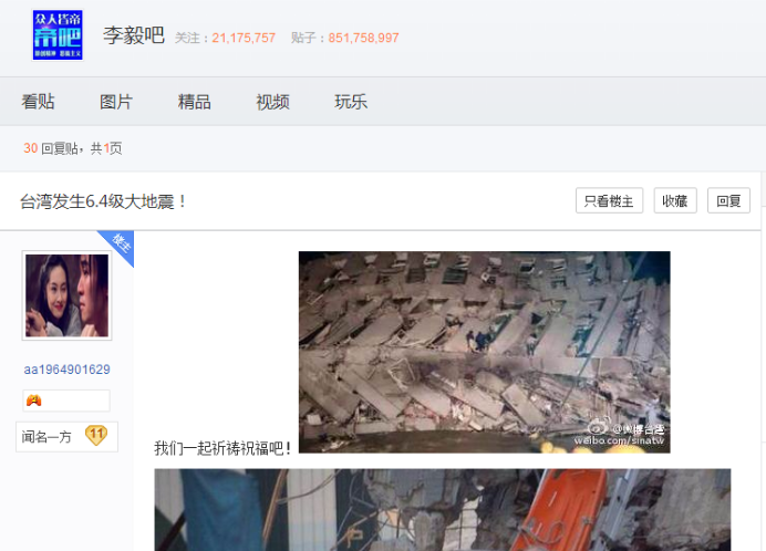 地震发生后,中国青年网记者在此前因帝吧出征行动,为海峡两岸网友熟知的百度李毅吧上发现,不少网友相继发布台湾地震的有关图文消息,并号召吧内网友共同祈福,称兄弟之间吵架归吵架,为台湾高雄祈福。