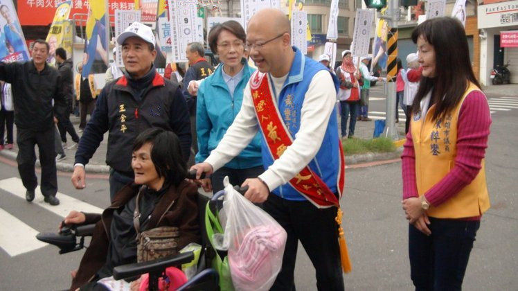 王金平(黑衣)等陪国民党第八选区候选人黄玺文(右2)凤山街头拉票,黄玺文协助行动不便民众过马路。