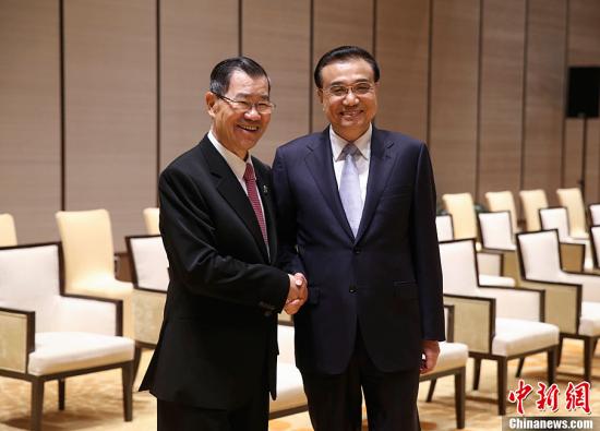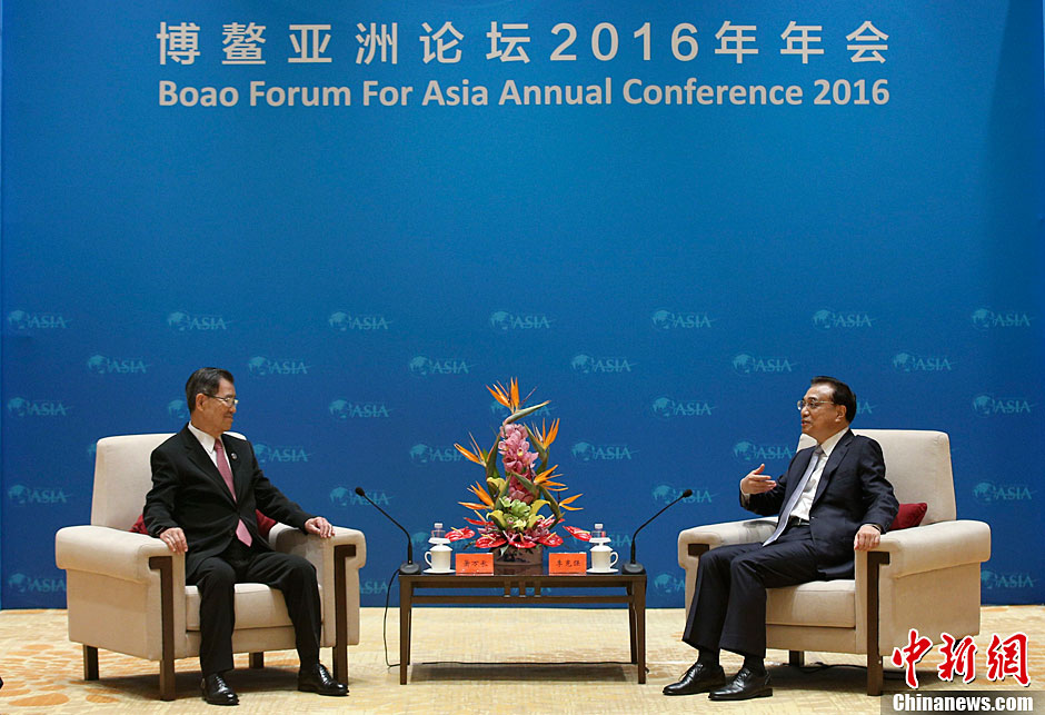 3月24日下午,国务院总理李克强在海南博鳌会见两岸共同市场基金会荣誉董事长萧万长一行。中新社记者 刘震 摄
