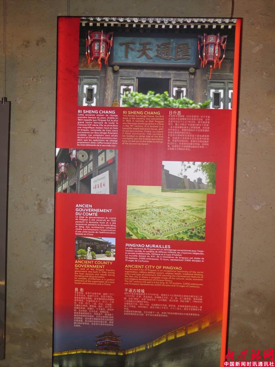 普罗万平遥旅游促销展示区设在修道院靠近教堂的一侧,共设置了三个板块和一个视频播放区。第一个板块是普罗万与平遥作为世界遗产的价值和友好城市交往情况;第二个板块是古城景区介绍;第三个板块是古城主要旅游品牌介绍,包括平遥国际摄影大展、平遥中国年等。视频介绍区用大屏幕电视机滚动播放中法文的山西、晋中和平遥旅游宣传视频片。
