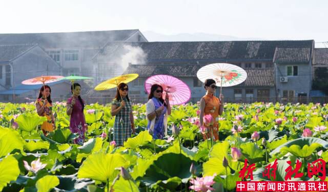 竹篱笆、木质栈道、小桥、游船等,成为游客拍照的热门地。另外,村里还准备了各式旗袍、民国服等服装出租,配以油纸伞、扇子等道具,身着独具特殊的旗袍,手撑一把油纸伞在荷花中穿行,仿佛穿越一般。
