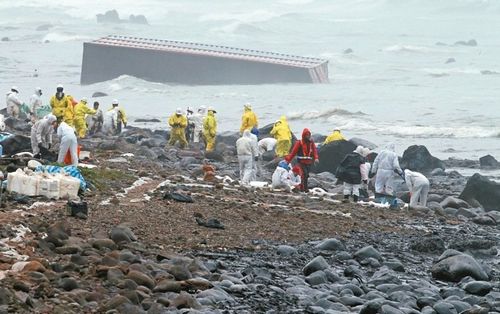 搁浅的德翔台北货轮,船体断裂,数个货柜落海,重油不断溢出,新北市环保局3月25日派出大批人力清理油污。来源:台湾《联合报》