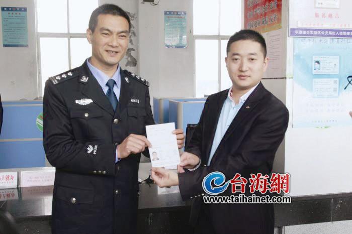 新时社网4月2日讯(海峡导报驻福州记者杨文通讯员周娇娇文/图)4月1日起,经公安部批准的临时来闽省外居民可办一次有效往来台湾通行证新政正式落地实施。当日上午10点,来自湖北宜昌的游客刘海峰,在平潭综合实验区出入境窗口大厅领到了首张一次有效往来台湾通行证(如图)。一次有效往来台湾通行证是4月1日正式实施的、公安部为支持福建自贸区建设而推出的10项出入境政策新措施之一,它允许临时赴闽的福建省外居民经福州、厦门、泉州三地赴金门、马祖、澎湖团队旅游,或经厦门乘坐邮轮、经平潭乘坐直航客船赴台湾团队旅游,可在当地有资质旅行社的组织下,向当地公安机关出入境管理部门申办一次有效往来台湾通行证,不受暂住期限等条件限制。