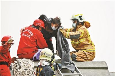 记者抵达时,看到救援人员刚刚救出一名民众,他的精神状态尚好,在担架上还能和救援人员进行交流。救援人员向其了解楼内其他受困人员的情况和位置之后,将其送往医疗站接受进一步治疗。