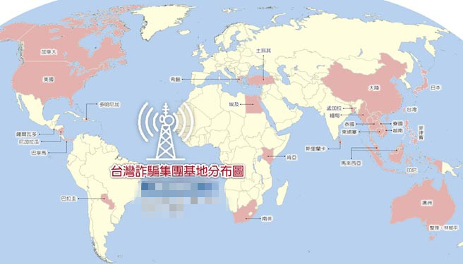 台媒制作的台湾诈骗集团基地分布图,因为相关文字不符合一中原则,故打码