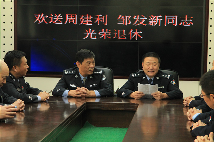 退休仪式上,周建利、邹发新 退休老同志回顾了自己的从警生涯,流露出了对公安工作和组织的情感与不舍,表达了对单位和战友的期望与祝愿,并表示退休不褪色,今后的生活中仍以一名合格人民警察的标准严格要求自己。