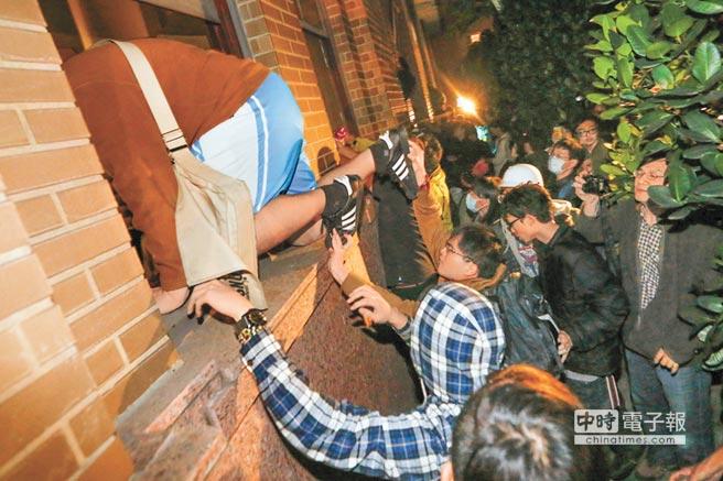 2014年3月23日,反服贸学生翻越栏杆并破窗冲进行政院。(图片来源:台湾《中时电子报》)