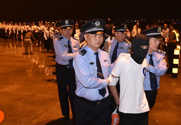 4月30日,在广州白云国际机场,97名电信诈骗犯罪嫌疑人被押解回国。(图片来源:新华社)