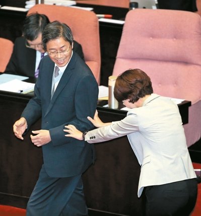 立法院昨天开始总质询,民进党立委陈亭妃(右)质询前找行政院长张善政(左)沟通台南震灾问题,恰好张要进休息室洗手间,陈只好开玩笑地推他先去。图片来源:台湾《联合报》