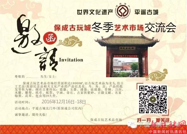 新时社山西站站长杨文阁报道: 山西平遥保成古玩城2016年冬季大型交流会即将到来,据悉这次冬季交流会时间:2016年12月16日-18日,其中12日-14日在保成古玩城内晟泰快捷酒店召开“床交会”,14日-18日冬季地摊大集继续。