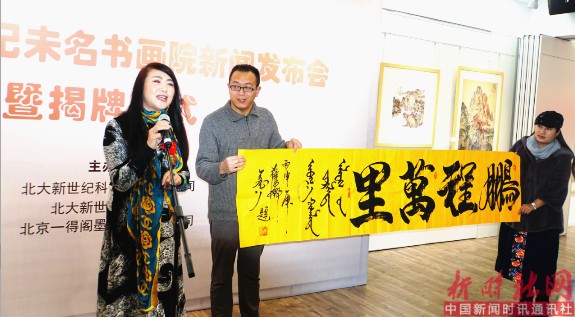 中国书法协会副主席、国家一级书法师、总政歌舞团内蒙古女高音歌唱家萨日娜赶写了一幅墨宝大会现场赠送给,北大新世纪未名书院。