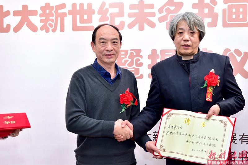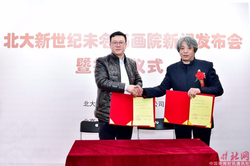 北大新世纪未名书院与民主与法制新疆书画院签约,形成战略合作伙伴。左为民主与法治新疆书画院院长郭辉。右为北大新世纪未名书院院长牛建华。