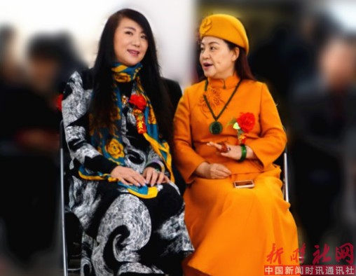 会场上左一萨日娜与北大新世纪未名书院佛学会代表张香兰亲切交谈,萨日娜她是中国音乐家协会会员,中国书法协会副主席,国家一级书法师,张大千大风堂书画研究院第四代传人,还是爱心、孝心慈善大使,影视演员。