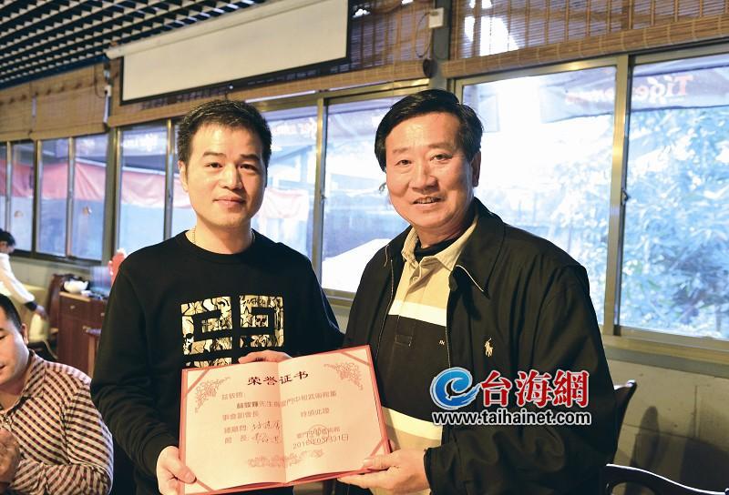 ▲武术馆顾问林建华(右)为林耀辉颁发聘书