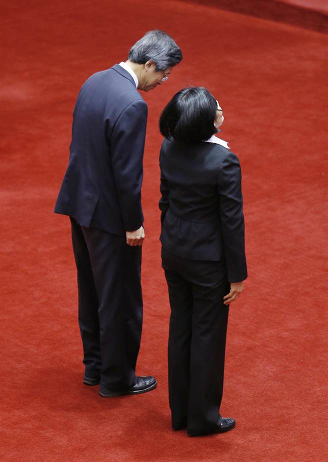 张丽善(右)鞠躬后,走到场中央的张善政(左)也跟着鞠躬。(图片来源:台湾中时电子报)