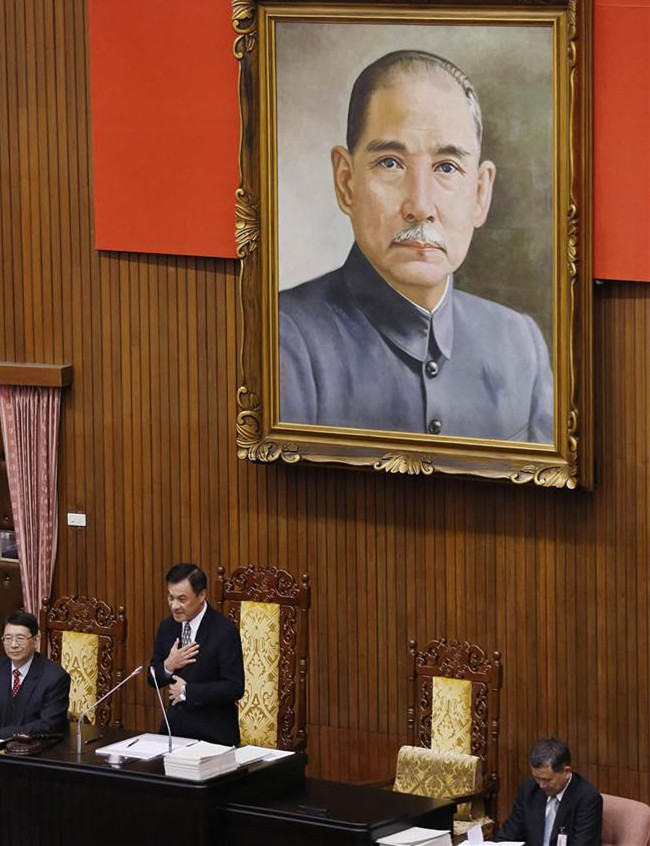 苏嘉全背后一幅巨大的孙中山遗像(图片来源:台湾中时电子报)