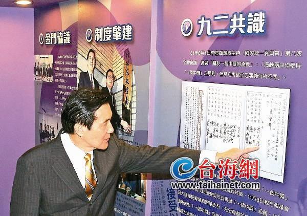 马英九表示,直到1992年11月两岸针对一个中国原则,达成了九二共识。他执政8年来,就是强调在九二共识的基础上与大陆互动,务实处理两岸诸多议题,才能成功争取到台湾以观察员身份参与世界卫生大会等国际组织。
