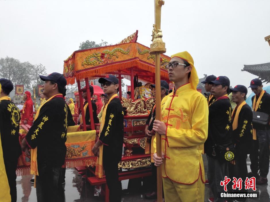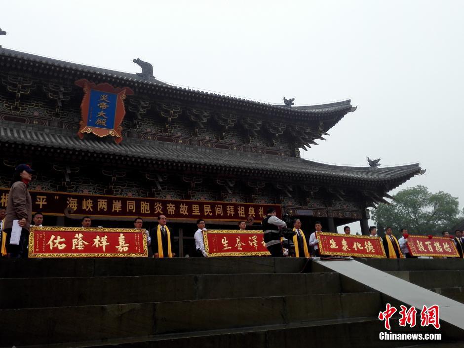 问祖炎帝 寻根高平海峡两岸同胞炎帝故里民间拜祖典礼5月14日在山西省晋城市高平市神农镇庄里村炎帝陵举办,3000余人共拜神农炎帝。来自台湾30余座宫庙的负责人集体向炎帝敬献了牌匾,并摘下帽子行三跪九叩最敬礼。高平现存有炎帝陵、炎帝行宫、炎帝寝宫、炎帝中庙、炎帝高庙等庙宇院落35处。 李娜 摄