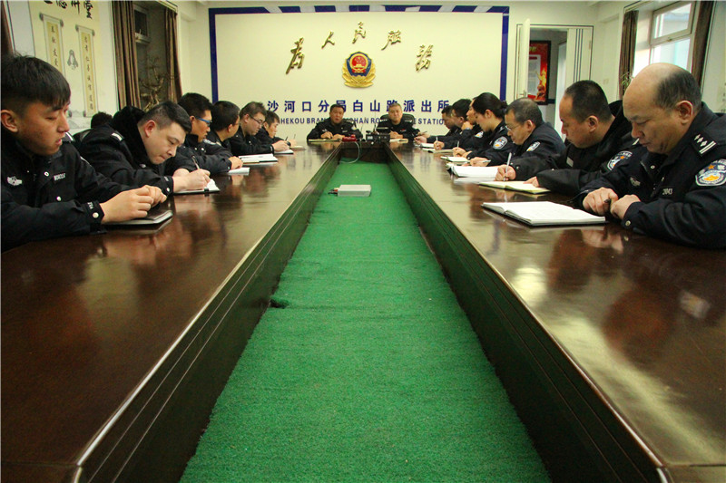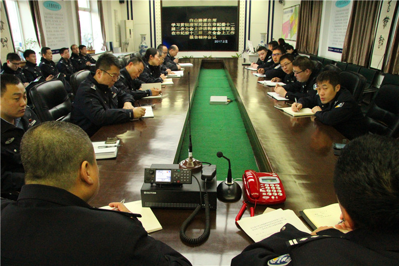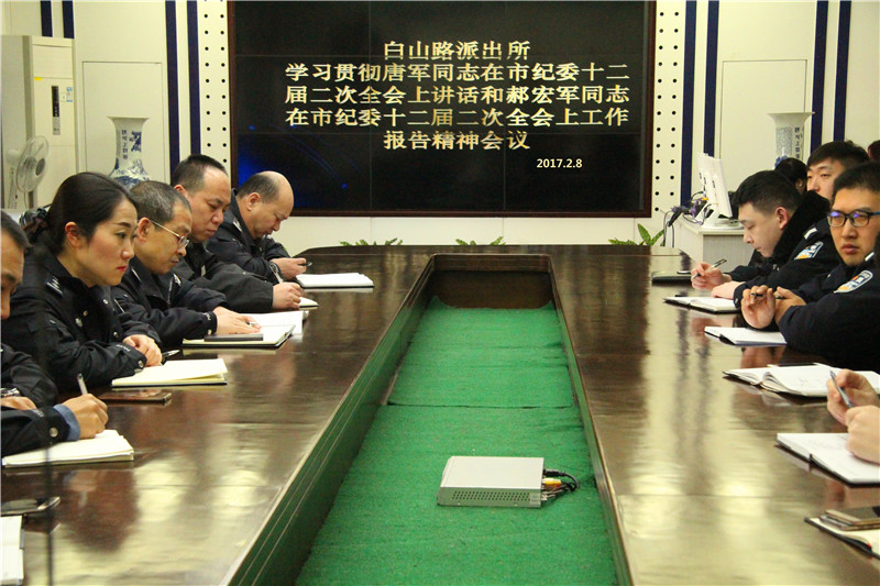 为了学习贯彻唐军同志在市纪委十二届二次全会上的讲话和郝宏军同志在市纪委十二届二次全会上的工作报告精神,2017年2月8日上午,大连市沙河口区白山路派出所组织全体民警,开展学习市纪委十二届二次会议工作报告精神会议。