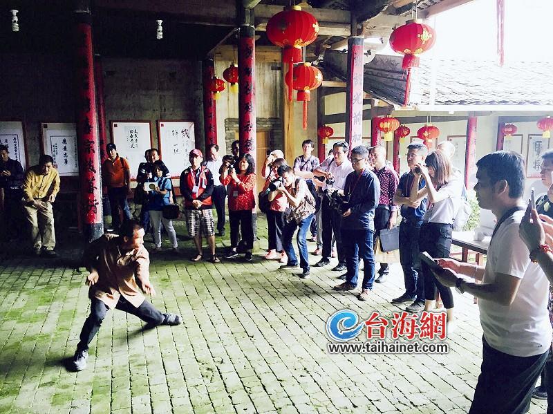 随后,采访团来到甘棠乡的一个古村落漈下村,这是个拥有1700多人口的小村庄,风景宜人,建筑富有特色。这个村出过戍台名将甘国宝,他曾两度担任台湾总兵,乾隆皇帝御赐福字牌匾,至今仍珍藏村中。漈下村还有一个有趣的称呼叫拳头窝,因为村里的男性大多习武,打的拳叫做虎桩拳,村民练武以往是为了防身,而如今是为了强身健体、传承文化。这不,村民们知道有台湾记者来采访,立刻显露了几手,连锄头和竹竿,都可以信手拈来当武器。