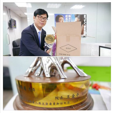 由于不满台湾立法院以国民党籍前立法院长王金平名义致赠的纪念杯是made in china,有民进党及台联立委昨日大发牢骚,不断拽咧子(对不满意的事使性子、说闲话、不断撒气)。