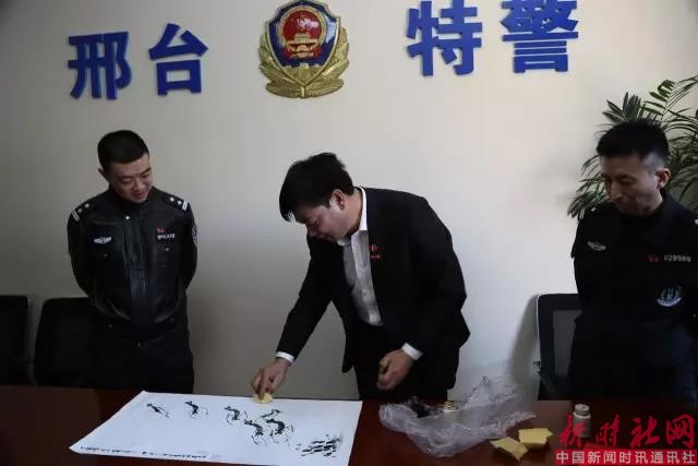 草根烙画艺人”彭广平,获悉邢台特警被命名为“河北省优秀志愿服务品牌——雷锋式特警队”后,特在第54个“3.5学雷锋纪念日”即将到来之际,携邢台慈行牛城公益组织、邢台无偿献血服务队等一行30余人,于3月1日,来到特警支队驻地,赠送了其亲自创作的传统烙画——《雷锋画像》,并对特警支队践行雷锋精神取得的优异成绩,给予了高度赞扬。