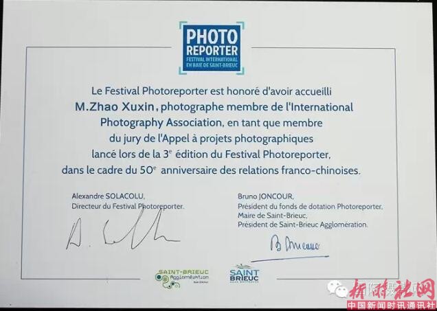 赵旭新:2014年,在中法建交50年之际,我应邀参加了法国布列塔尼的国际纪实摄影展的评委并前往法国参与交流活动。作为评委,由我们协会选送了30多幅(组)作品参加评选,其中有一个大奖名额分配给中国,在最后的评选中,法方说中国情况赵先生熟悉,这个奖由赵先生来推荐。我推荐了中国摄影师郭晓明老师的一组反映农村结婚闹洞房的题材,展览出去以后效果非常好,当地媒体给予了大篇幅的报道。