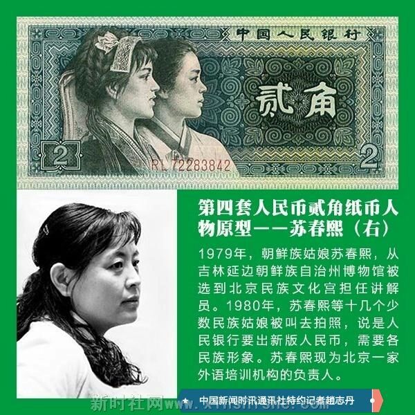 另一位姑娘叫苏春熙,也是1979年从延边朝鲜族自治州博物馆被选到民族文化宫担任解说员的。1980年夏天,苏春熙和其他十几名少数民族少女被北京民族文化宫的老师叫去拍照,当时只听说摄影师是银行方面带来的,还说是要出新版的人民币。现为北京某外语培训机构负责人。