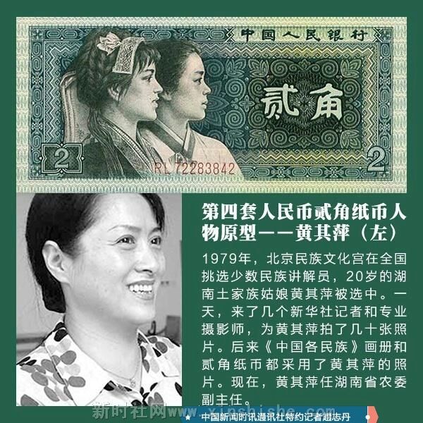 1979年4月,黄其萍正好20岁。国庆30周年前夕,北京民族文化宫为举行全国民族工作展览,在各地挑选少数民族讲解员。黄其萍作为湖南土家族的代表被选中了。有一次,来了几个新华社的记者和专业摄影师,为黄其萍拍了几十张头像。1981年,《中国各民族》画册出版了,其中有黄其萍的照片。此后在1980年版的贰角人民币上又采用了黄其萍的头像(左1)。