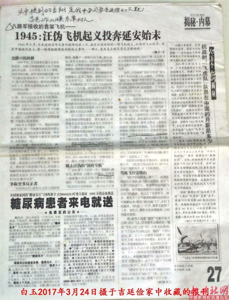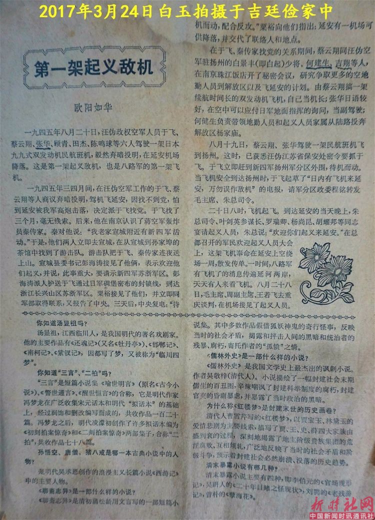 我带给了吉廷俭两张老照片,他非常高兴便找出了全家福和我们合影,他说他爸爸这个在飞机下的照片他从末见过,手上也没有相关爸爸的照片他从小在奶奶家长大,很小时爸爸就牺牲了,他还说这张照片太珍贵了一定好好保存。