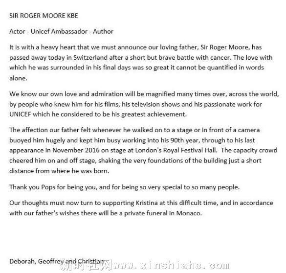 据罗杰·摩尔的家人透露,他是在“与癌症进行了短暂但英勇的搏斗”后去世的。
