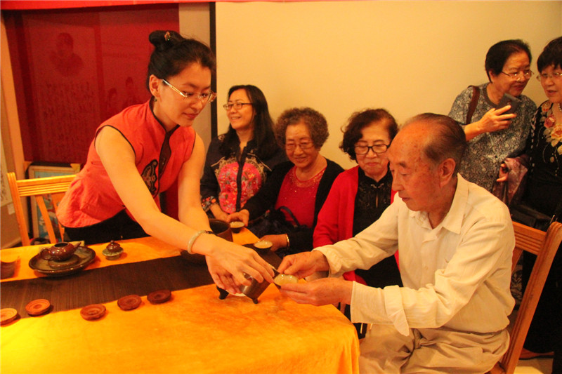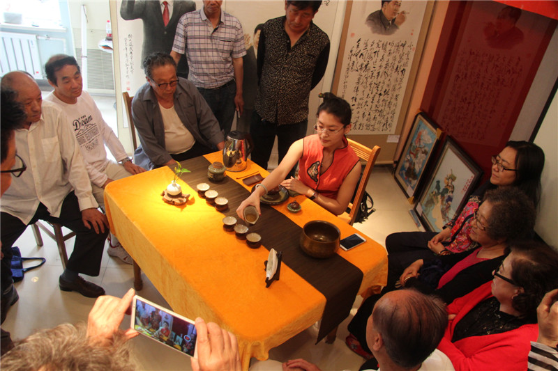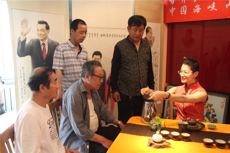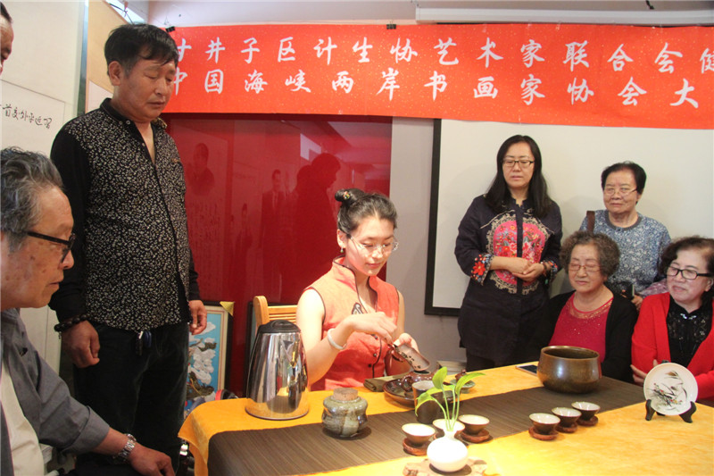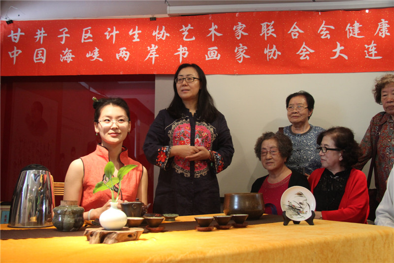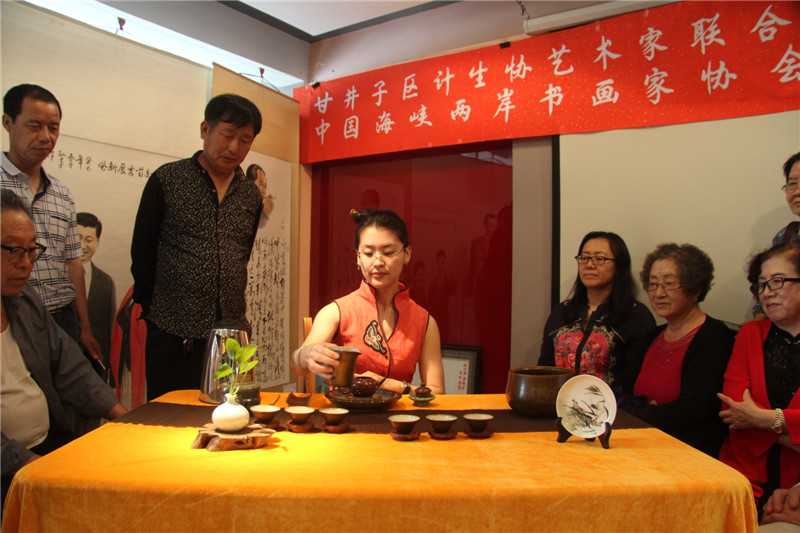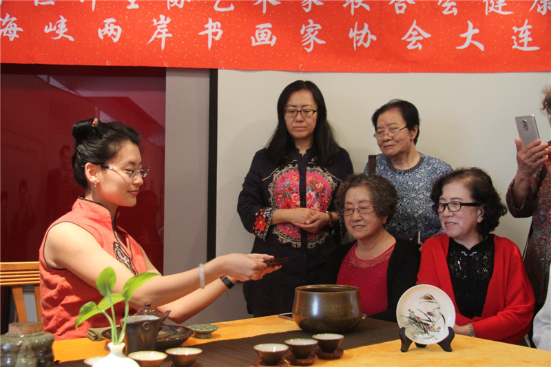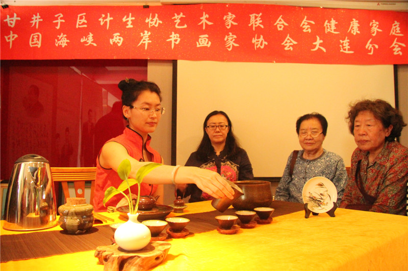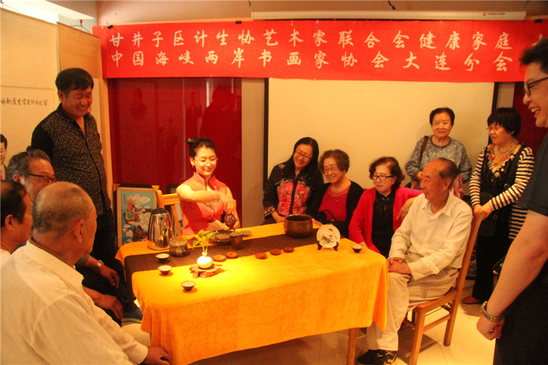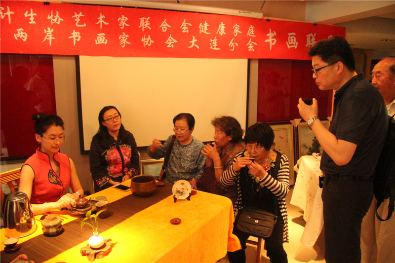 活动现场,也是「“甘井子区计生协艺术家联合会o健康家庭”“中国海峡两岸书画家协会大连分会”书画联展」的现场,会员们纷纷将参加「2017年纪念中国人民解放军建军90周年全国诗词书画摄影作品大赛」和「2017年纪念香港回归祖国二十周年全国诗词书画摄影作品大赛」的参赛作品加以整理登记,以书画艺术祝贺祖国的两大重要而有意义的纪念日。「国家一级评茶师」「大连茶协会茶艺师、评茶师委员会委员」「台湾黑珍珠茶行」 刘勤 女士及其助手 张丽慧 女士也来到了活动展厅,为现场的艺术家和书画爱好者们带来了精彩的茶文化讲解及台湾茶艺展示,让大家在茶事体验中寻求意境,感悟真谛。在舒缓动听的古典音乐中,两位茶艺老师通过优雅的茶艺表演,完整地展现了中国传统台湾茶艺文化。刘勤 女士作为一名茶艺传播者,十多年来,无数次地奔波于海峡两岸,为的就是弘扬中华茶艺。刘勤 女士说:通过讲解茶道历史,让大家了解海峡两岸源远流长的茶文化,大家在挥毫泼墨的同时品尝清茶,不仅弘扬了传统文化,还相互切磋了技艺。和乐融融的气氛、优雅的茶艺展示和精彩的茶艺讲解,赢得了在场艺术家们的好评和欢迎。