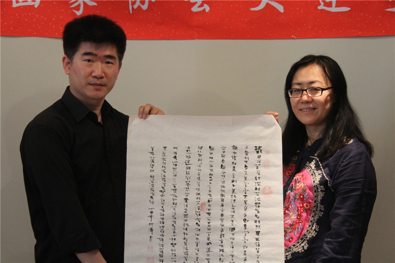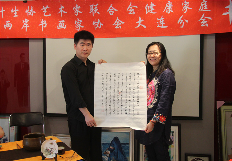 刘勤 女士的侄儿 “钧翔”,出生于台湾台北市,今年18岁,一直和在解放后失散于台湾的父母生活在一起,虽然已有18岁,但还是个智商只有7、8岁的智障儿童。最近,家人发现 钧翔 开始拿起毛笔经常的写写画画。有一天,钧翔 居然工整的用自己的字体完整的书写了“般若波罗蜜多心经”,台湾家人以及 刘勤 女士都感觉到非常惊讶,同时也感觉到非常的高兴。刘勤 女士将侄儿 钧翔 的“般若波罗蜜多心经”图片传给了「中国海峡两岸书画家协会大连分会」副会长 何涛 先生,何涛 副会长看过作品后,灵感突发,以 钧翔 的字体为本,再加上自己的感悟和笔法,临摹创作了“钧翔版本的般若波罗蜜多心经”,现场赠送给了 刘勤 女士。刘勤 女士表示要将这幅作品带回台湾,转送给台北的 钧翔 和家人,以激励、鼓舞 钧翔。随后,刘勤 女士与 何涛 副会长及其作品合影留念。
